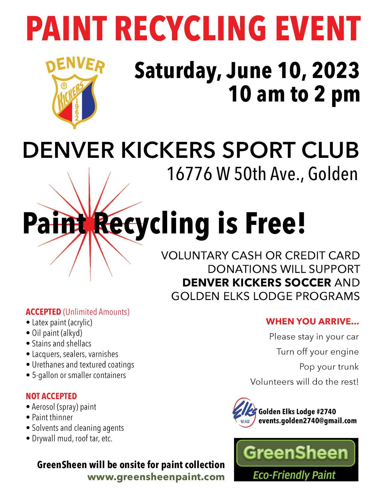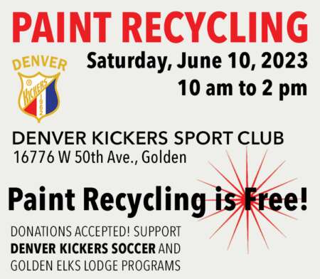 The Denver Kickers is hosting a paint recycling event in cooperation with the Golden Elks on Saturday, June 10 from 10 a.m. to 2 p.m. Paint recycling is FREE and there’s no limit to the amount of paint dropped off. There are limitations on the kinds of products that can be recycled – CLICK HERE for a flyer with specific information.